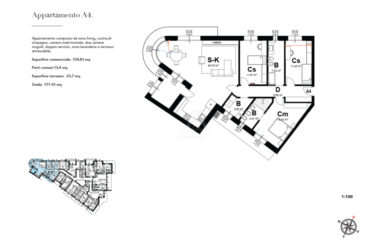 L'immobile si contraddistingue per i suoi spazi e per la sua luminosità, si estende per una superfice commerciale di 134mq.; la zona giorno è composta da uno spazioso soggiorno integrato dalla cucina.
